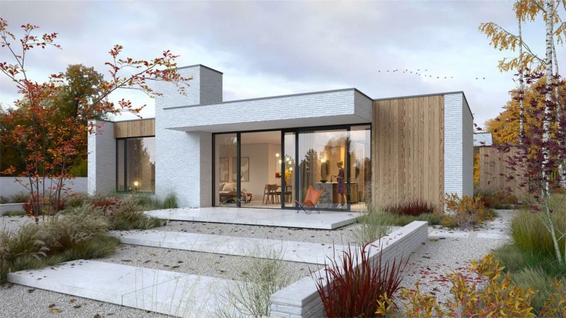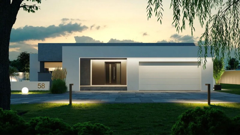 Крытая парковка на два автомобиля подходит к входной группе. Большой холл имеет панорамное остекление и необычную зону хранения в центре комнаты.