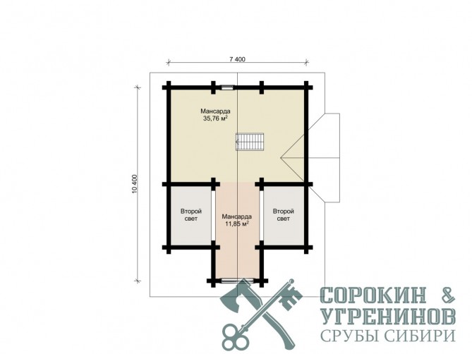 Индивидуальный проект дома из лафета сечением 250х350мм, площадь дома 153м2. Размер сруба 7;4х10,4 метров. Два этажа, второй мансардный. Скромная планировка дома, небольшие две комнаты на первом этаже, гостиная, санузел, прихожая и веранда, и две маленькие комнаты на мансарде. Этот домик может быть отличным украшением любого участка и для любимых гостей.